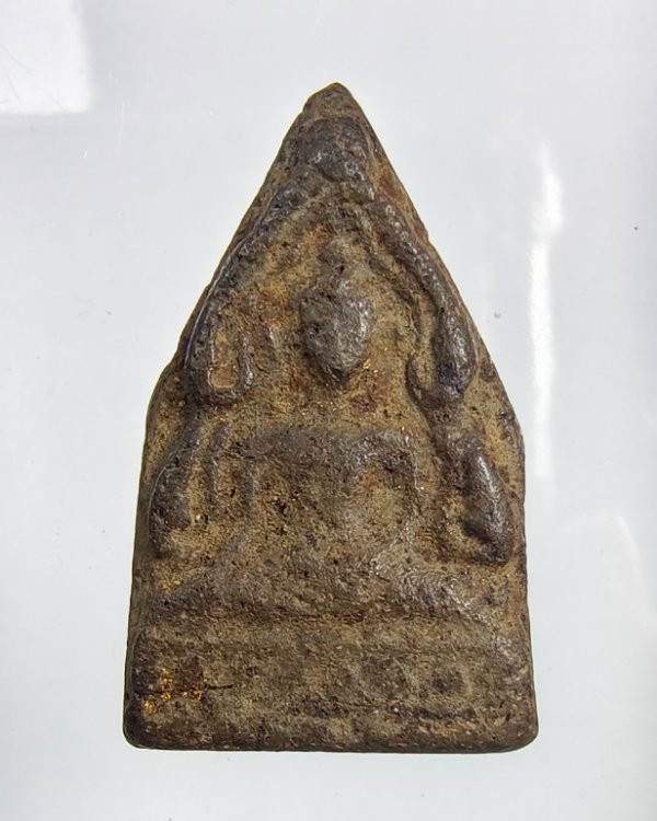 พระสรรค์นั่ง พิมพ์ไหล่ตรงข้างเม็ด เนื้อดิน พร้อมกรอบสแตนเลสอย่างดี |
