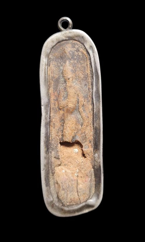 พระลีลาสรรค์หย่อง กรุวัดพิกุล เนื้อดิน จ.กำแพงเพชร เลี่ยมกรอบโบราณ มีจารด้านข้าง |