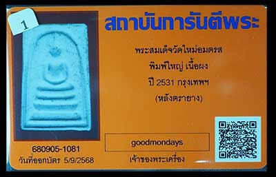วัดใจเคาะแรกแดงแต่ไม่วัดดวง กับพระรุ่นน้องที่อายุก็ไม่น้อยครับ พระสมเด็จบางขุนพรหม วัดใหม่อมตรส พศ.2539 เนื้อผงพิมพ์ใหญ่จัมโบ้ หนาๆสวยงามพร้อมกล่องวัดเดิมๆสภาพดี |