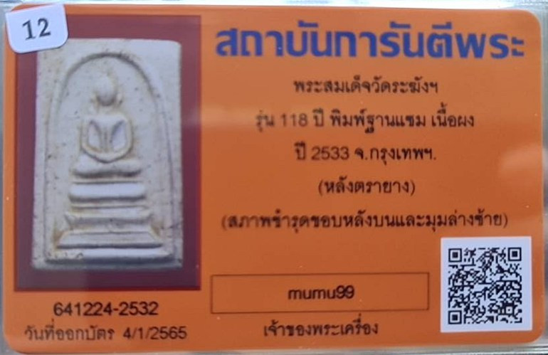 สมเด็จคะแนน 118 ปี วัดระฆังฯ พ.ศ.2533 มีกล่องเดิม สวมเดิม สภาพสวยตามรูป |