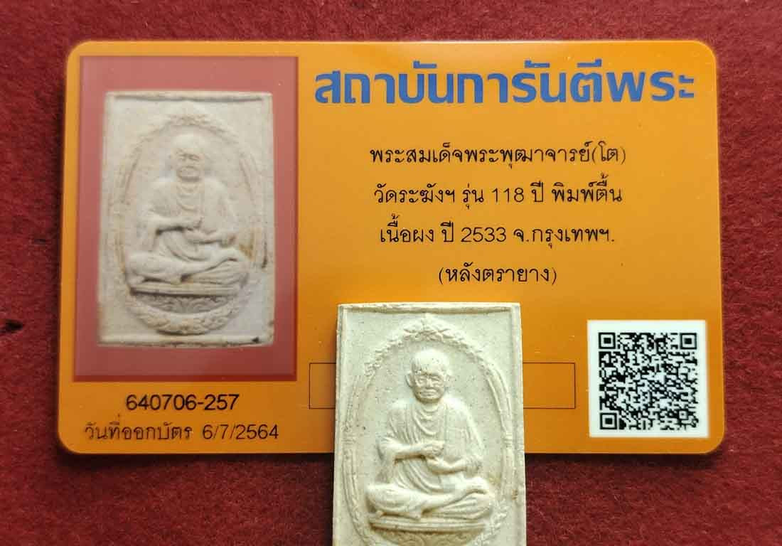 พระรูปเหมือนสมเด็จพระพุฒาจารย์(โต) วัดระฆังฯ รุ่น 118 ปี พิมพ์ตื้น ปี 2533 จ.กรุงเทพฯ (หลังตรายาง) พร้อมบัตรการันตีพระ |