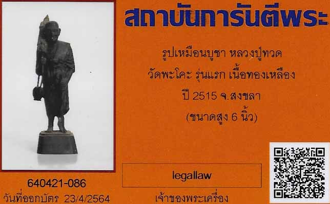 พระบูชาหลวงปู่ทวด วัดพะโคะ รุ่นแรก พ.ศ. ๒๕๑๕ สภาพสวยกริ๊บ+บัตรรับรองพระแท้*ส109