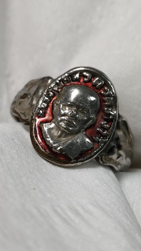 แหวนหลวงพ่อทวด วัดช้างให้ พิมพ์หน้าเม็ดแตง ปี 22 เนื้ออัลปาก้าชุบนิเกิ้ล ลงยาแดง |