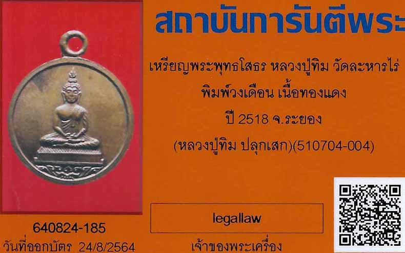 ** ต้นแบบ เหรียญเจริญพร หลวงปู่ทิม วัดละหารไร่ หล่อพระประธาน วัดสุวรรณรังสรรค์ (ยายร้า) เดิมๆ สวยงาม + บัตรรับรอง G-PRA |