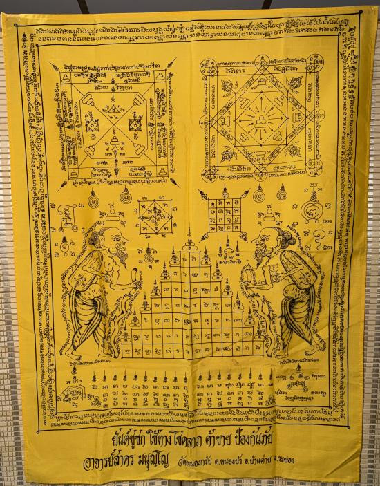 ผ้ายันต์ชูชก ผืนใหญ่ หลวงพ่อสาคร มนูญโญ วัดหนองกรับ จ.ระยอง ปี2548 กว้างประมาณ 67x 90 ซม. |