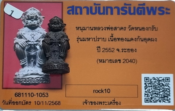 หนุมานมหาปราบหลวงพ่อสาคร มนูญโญ วัดหนองกรับ รุ่นมหาปราบ เนื้อทองแดงเถื่อนก้นอุดผงพรายกุมาร พิเศษ ตอกโค๊ดนุ ปี2552 จ.ระยอง หมายเลข 2040 สภาพสวยมากมาพร้อมบัตรรับรองจีพระ |