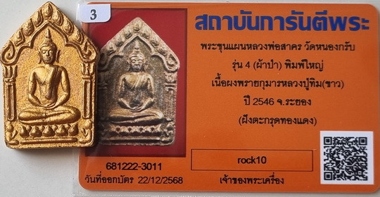 พระขุนแผนรุ่น ๓ พิมพ์เล็ก ตะกรุดเงิน เนื้อผงพรายกุมารหลวงปู่ทิม หลวงพ่อสาคร วัดหนองกรับ จ.ระยอง ปี 43 พร้อมบัตรรับรอง |