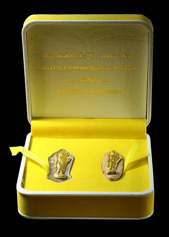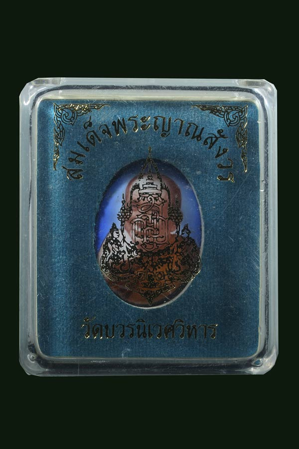 ล็อกเก็ตสมเด็จพระญาณสังวร สมเด็จพระสังฆราช วัดบวรนิเวศวิหาร ฉากสีทอง วาระครบ 100 ปี 3 ตุลาคม 2556 ด้านหลังตราสัญลักษณ์งา นฉลองพระชันษา ๑๐๐ ปี ภายในบรรจุเทียนชัย พร้อมกล่องเดิมๆ |