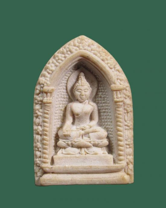 พระพุทธเมตตาเสนานาถ เนื้อผงพุทธคุณสีขาววัดพระศรีรัตนศาสดาราม (วัดพระแก้ว) จัดสร้างโดย กองทัพบก ปี ๒๕๔๔ พร้อมกล่อง มีจาร 3 ด้าน |