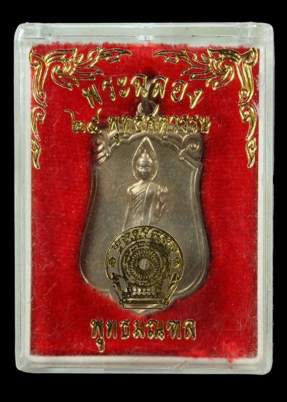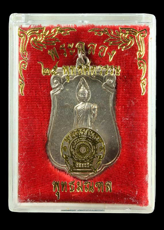 เหรียญเสมา พระพุทธ 25 ศตวรรษ เนื้ออัลปาก้า พิมพ์ลึก(แขนโต) นิยม สวยงามเดิมๆ พร้อมกล่อง และบัตรรับรองGPra |