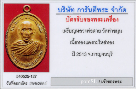 เหรียญหลวงพ่อสาย รุ่นแรก วัดท่าขนุน กาญจนบุรี ปี2513 มาพร้อมบัตร G ครับ |