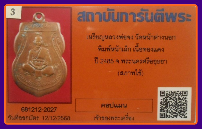 เหรียญหลวงปู่หน่าย วัดบ้านแจ้ง รุ่น4 นิยม พิมพ์ห่วงเชื่อม เนื้อทองแดง ปี 2518 อยุธยา บัตรรับรอง |