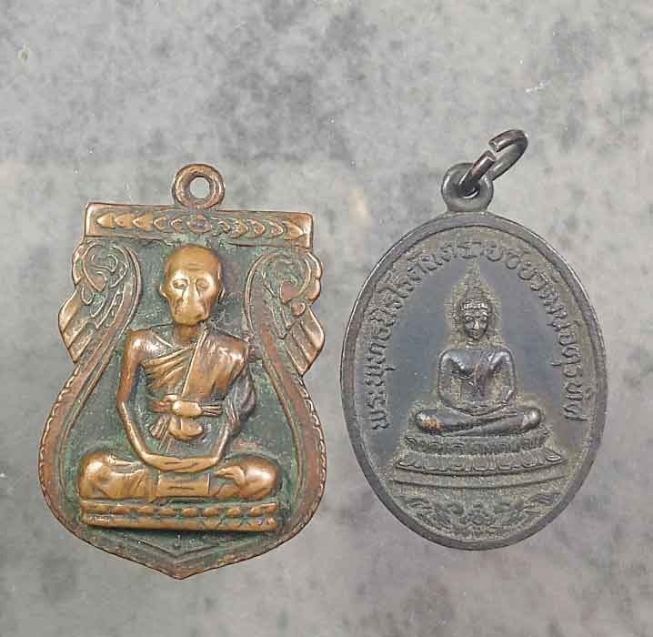 เหรียญหลวงพ่อพระครูบาง เจ้าอาวาสวัดหนองพลับ อ.หนองแซง จ.สระบุรี ปี06 + เหรียญพระพุทธนิรโรคันตรายชัยวัฒน์จตุรทิศ ปี19 เปิดศาลเจ้าพ่อหลักเมือง สระบุรี |