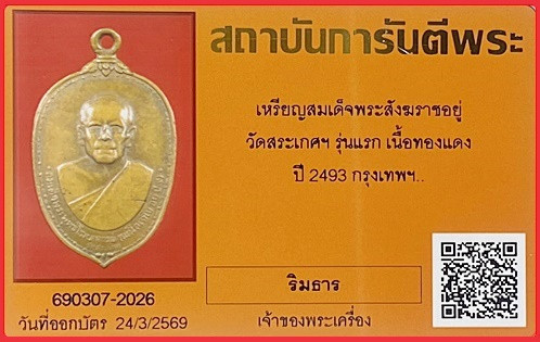 เหรียญสมเด็จพระพุทธโฆษาจารย์เจริญ เขาบางทรายพิมพ์หลังพระ มาพร้อมบัตร |