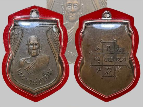เหรียญหลวงพ่อกวย ปี 2515 รุ่น ยกช่อฟ้า วัดเดิมบาง เนื้อทองแดงรมดำ ไหล่จุด หูขีด พร้อมบัตรรับรองพระเครื่องของสถาบันการันตีพระ |