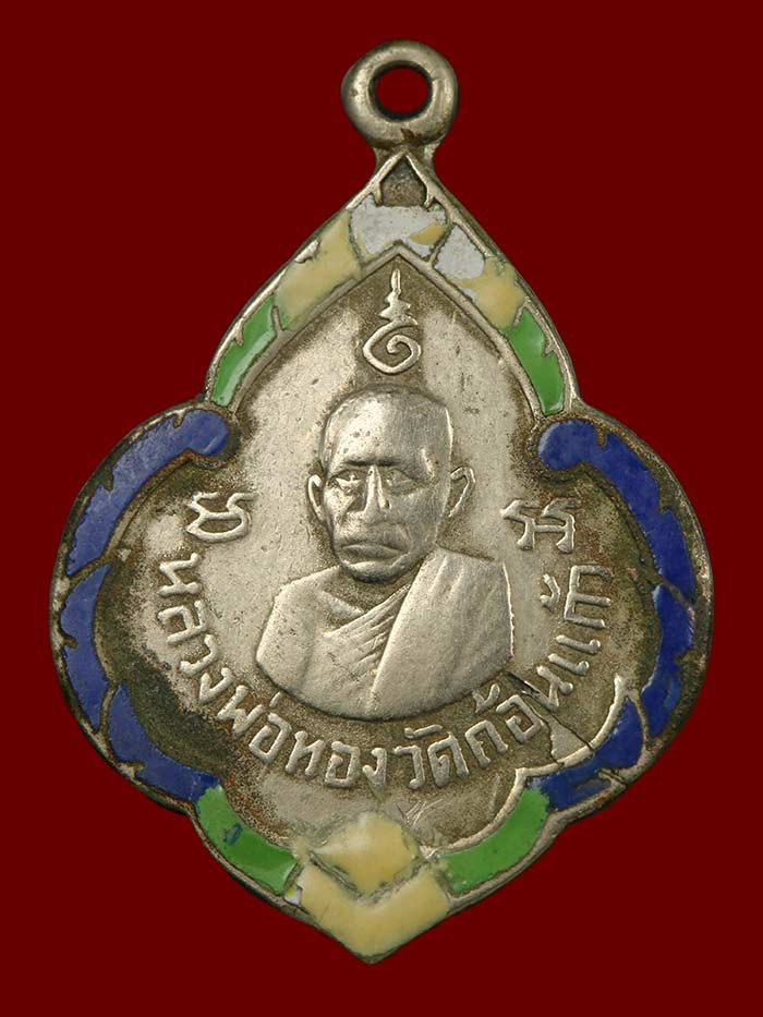 วัดใจ เหรียญใบพุทรา หลวงพ่อทอง วัดก้อนแก้ว จ.ฉะเชิงเทรา เนื้อกะไหล่ทองลงยา ปี2524 |