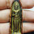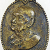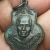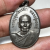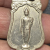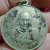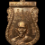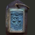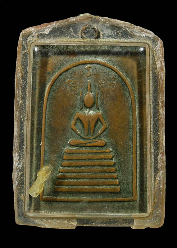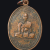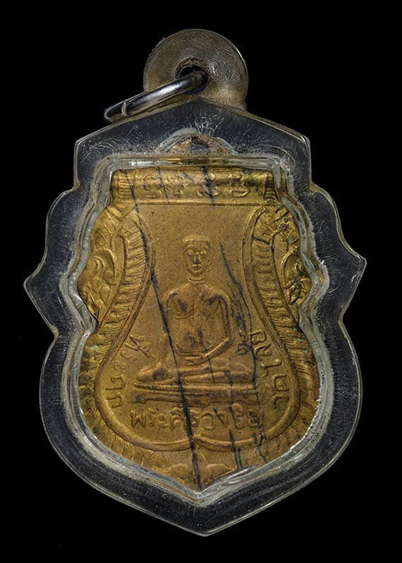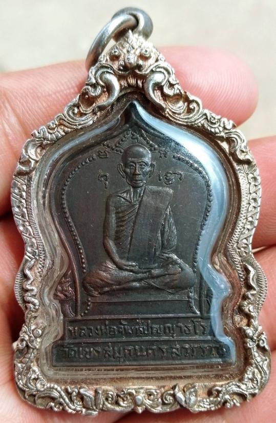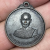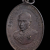 เหรียญหล่อโลหะเก่าๆด้านหลังมีจาร เลี่ยมกรอบพลาสติกสีน้ำตา ห่วงขึ้นสนิม เคาะเดียว |