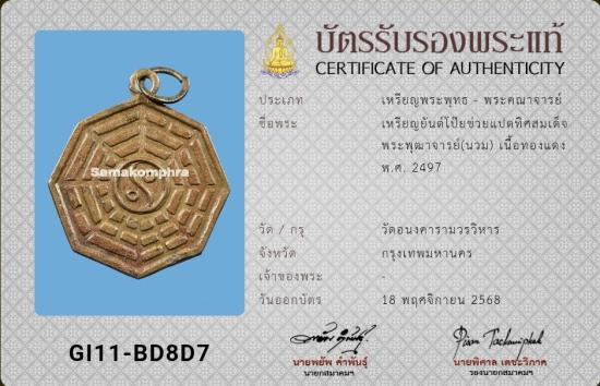 เหรียญพระประจำวัน สมเด็จพระพุฒาจารย์นวม วัดอนงคาราม กทม. ปี 2497 เนื้อทองแดงกะไหล่ทอง |