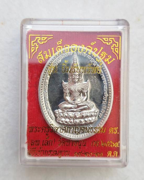 เหรียญสมเด็จองค์ปฐมยิ้มรับทรัพย์ เนื้อปีกเครื่องบินพิมพ์ใหญ่ เลข 6563 พระอาจารย์เล็ก วัดท่าขนุน จ.กาญจนบุรี |
