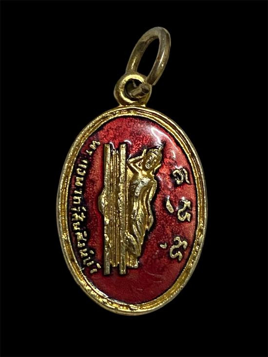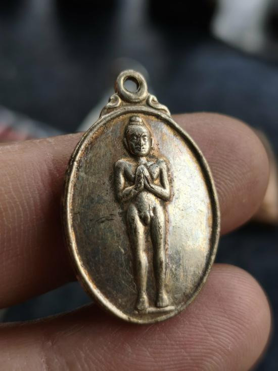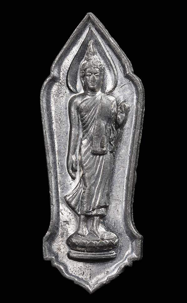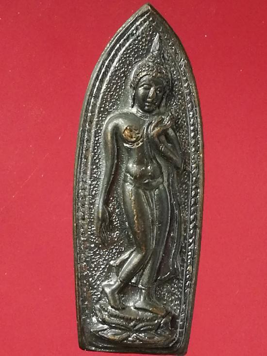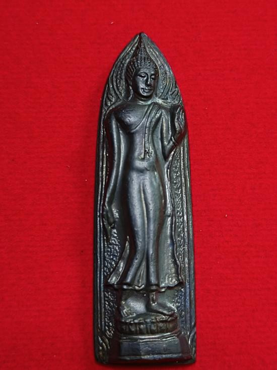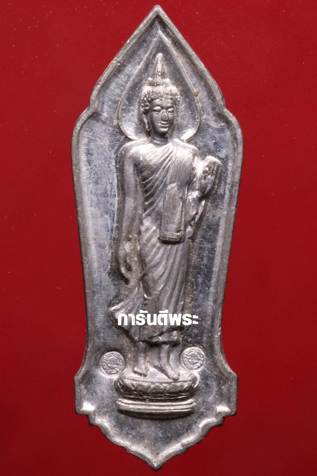 พระลีลากำแพงนิ้วซุ้มฉัตร หลวงพ่อขอม วัดไผ่โรงวัว (วัดโพธาราม) สุพรรณบุรี ปี ๒๕๐๕ เนื้ออลูมิเนียม เลี่ยมกันน้ำเก่า |