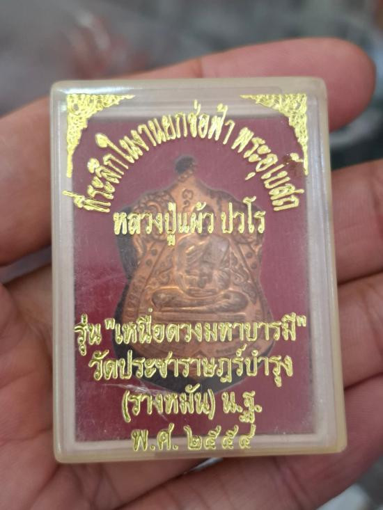 หลวงปู่แผ้ว วัดรางหมัน รุ่น เหนือดวงมหาบารมี ปี 54 ทองแดง กล่องเดิม หมาเยลข 3435 |