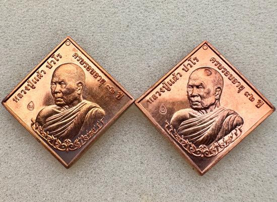 เหรียญข้าวหลามตัดหลวงปู่แผ้ว วัดรางหมัน ปี 57 ครบรอบอายุ 92 ปี เนื้อทองแดงผิวไฟ สภาพสวยตอกโค๊ตชัดเจน มีมา 2 เหรียญ |