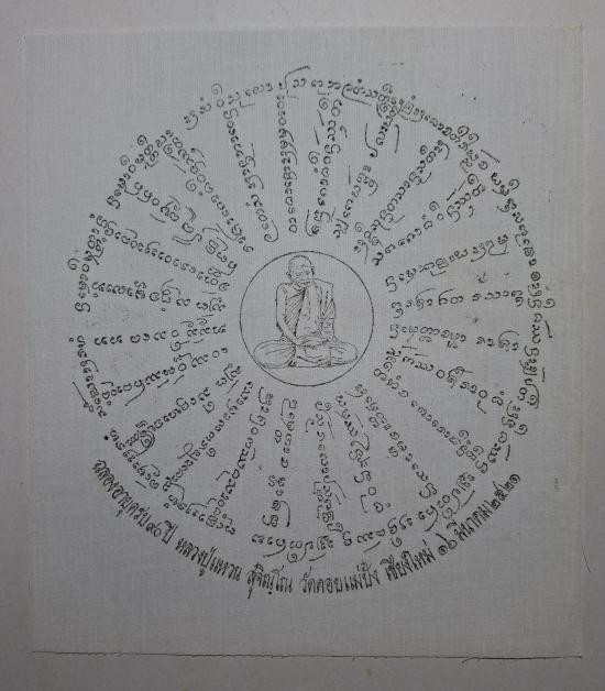 ผืนใหญ่..ขนาด19 X 29 นิ้ว... ผ้ายันต์ครอบจักรวาล 108 หลวงพ่อเกษม รุ่นพุทธคุณ ปี2538 เลข 550 ... 69.1.15 |