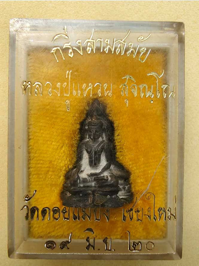 150.- พระกริ่งสามสมัย หลวงปู่แหวน สุจิณฺโณ วัดดอยแม่ปั๋ง อ.พร้าว จ.เชียงใหม่ ปี2520 เนื้อนวะโลหะ สภาพสวยผิวเดิม กล่องเดิม |