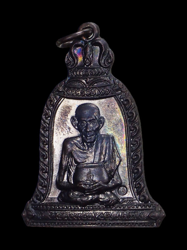 เป็นเหรียญพิมพ์ระฆังที่วัดอัมพวา กรุงเทพมหานคร สร้างเป็นที่ระลึกยกช่อฟ้าพระอุโบสถ ปี 2517 เนื้อทองแดงรมดำ ขนาดกว้างสุดประมาณ 2.8 ซม. สูงรวมหูเหรียญประมาณ 3.9 ซม.สภาพสวยไม่ผ่านการใช้ |
