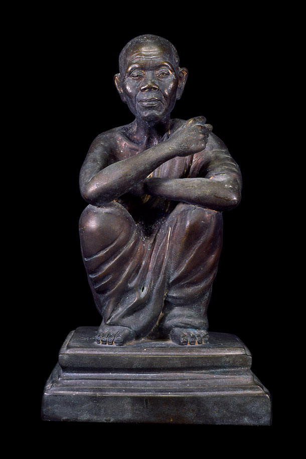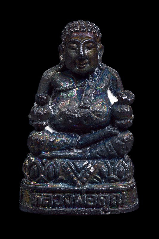 พระสังกัจจายน์ ( พิมพ์ถือถุงเงิน ) รุ่น คูณลาภ คูณเงิน คูณทอ ง ( เนื้อทองแดงรมดำ ) พ.ศ.2536 ( กล่องเดิม ) |