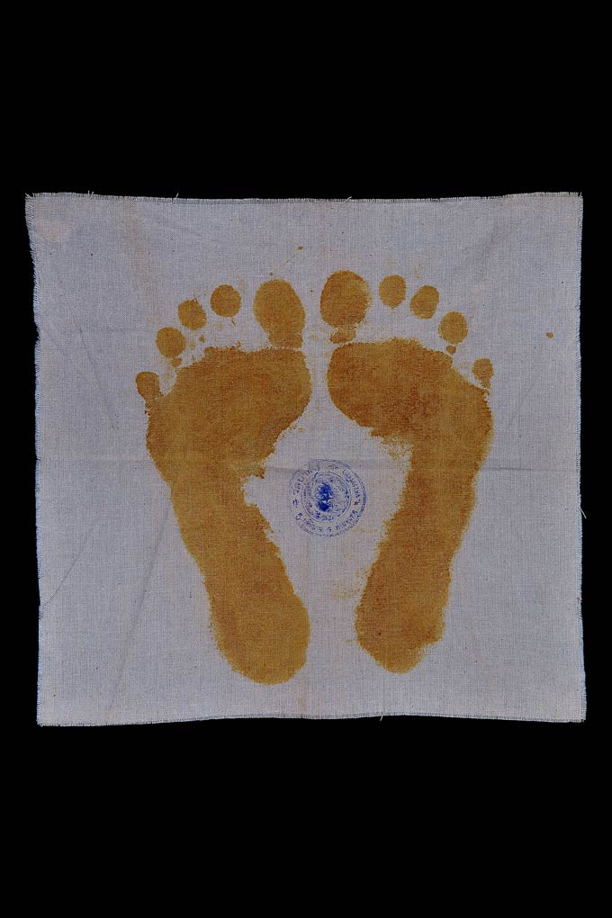 ผ้ารอยเท้าประทับคู่ด้วยขมิ้นสด ( ซ้าย - ขวา ) พ.ศ.2536 ( ปั๊มตราวัดบ้านไร่ ) |