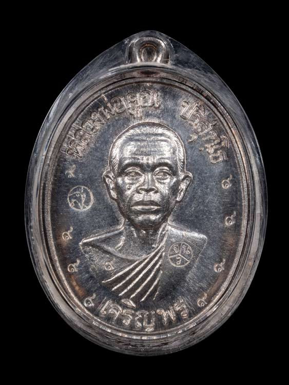 หลวงพ่อคูณ รูปเหมือนใบโพธิ์ รุ่นแรก เบอร์ 15 เนื้อเงิน ปี36 เลี่ยมกันน้ำพร้อมกล่อง |