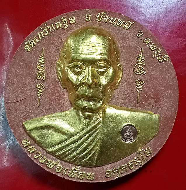 หลวงพ่อเพี้ยน วัดเกริ่นกฐิน อำเภอบ้านหมี่ จังหวัดลพบุรี รุ่น มนต์มหากาฬ (ไตรมาส 59) เนื้อทองฝาบาตร สร้างปี พ.ศ. 2559 |