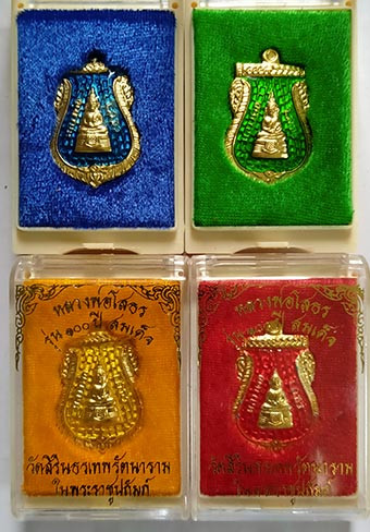 เหรียญหลวงพ่อโสธร รุ่นประวัติศาสตร์ ครบรอบ 255 ปี (วาระพิเศษ) หมายเลขสวย 98 เนื้อชุบทองลงยาน้ำเงิน ลงยาเครื่องทรง หลังลงยาพื้นแดงลงยาตราวัด ลงยาจีวร กล่องเดิม |
