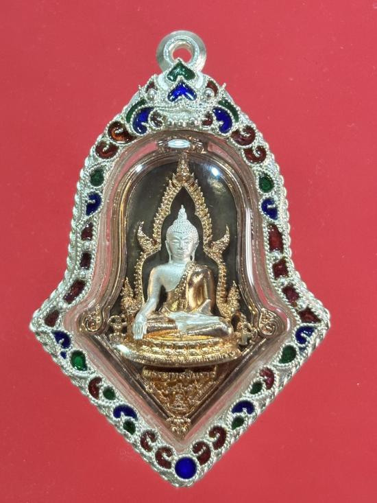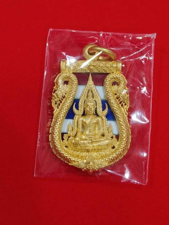 เหรียญพระพุทธชินราชเสมาฉลุลาย ยกซุ้มพญานาค รุ่นมหาจักรพรรดิ ปี 2555 เนื้อบรอนซ์ลงยาราชาวดี สีธงชาติ ชุบทองไมครอน |