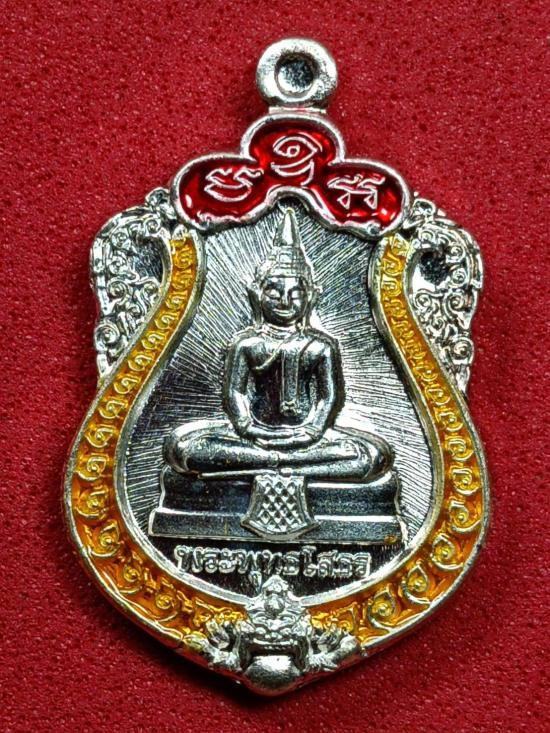 ( เลข 1296 ) เหรียญโล่ห์พระพุทธชินราช หลังยันต์วิเศษอกเลาโภคทรัพย์ เนื้อทองทิพย์ลงยาสีแดง รุ่น สมโภชพระพุทธชินราช ครบ ๖๖๖ ปี |