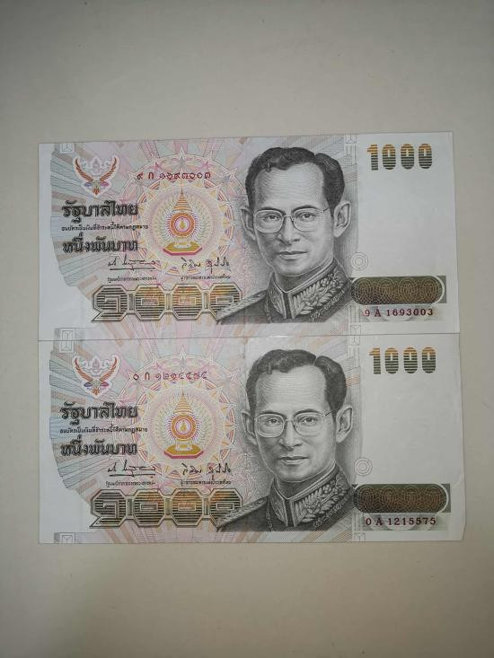 ธนบัตรรักาลที่ 9 ใช้แล้ว ฉบับละ 1000 บาท รวม 2 ฉบับ ตามรูปเคาะเดียว |
