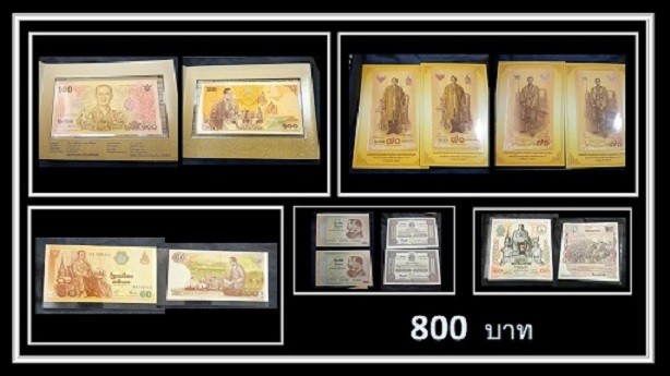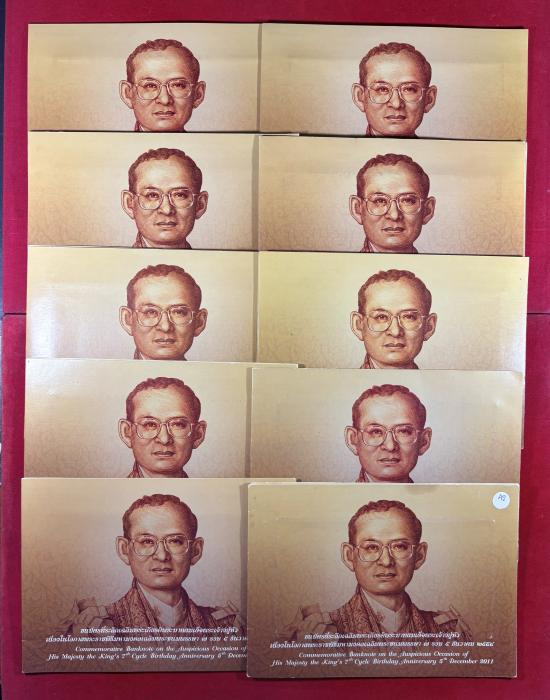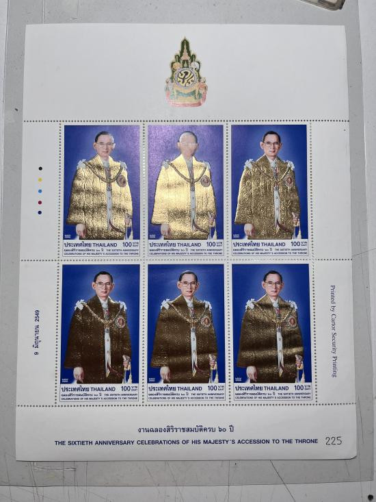 แสตมป์ที่ระลึกงานฉลองสิริราชสมบัติครบ 60 ปี พระบาทสมเด็จพระเจ้าอยู่หัวภูมิพลอดุลยเดช เป็นแสตมป์ใหม่ที่ยังไม่ผ่านการใช้ ราคาหน้าแสตมป์ดวงละ 100 บาท จำวน 6 ดวง |