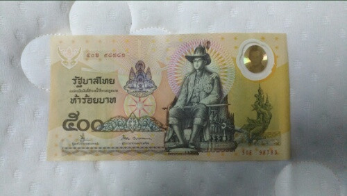 ธนบัตรที่ระลึกเฉลิมพระเกียรติ ฉลองสิริราชสมบัติครบ 50 ปี พระบาทสมเด็จพระปรมินทรมหาภูมิพลอดุลยเดช (ฉบับละ 500 บาท ) ชุดผ้าไหมทอมือ หมายเลข 98783 |