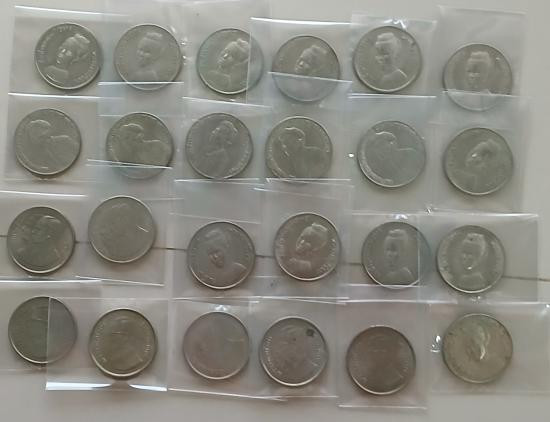 แผงพร้อมเหรียญ 20 นิเกิลชนิดราคา 20 บาท+เหรียญเงิน 20 บาท 3 รอบ ในสมัยรัชกาลที่ 9 ครบทุกวาระ 71วาระ+เหรียญเงิน ทั้งหมดรวม 72 วาระ เหรียญสภาพไม่ผ่านการใช้งาน พร้อมแผงสีน้ำเงิน จำนวน 1 แผง ครับ |