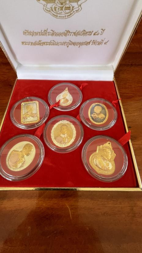 ชุดเหรียญกษาปณ์ที่ระลึกฉลองสิริราชสมบัติครบ 50 ปี ร.9 พระพักตร์ ร.5 มีทั้งหมดรวม 6 เหรียญ เนื้อสามกษัตรย์ สวยเดิมพร้อมกล่องเดิมครับ |