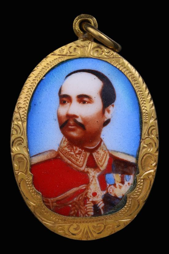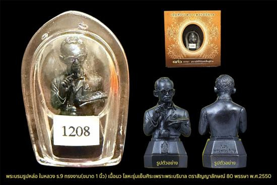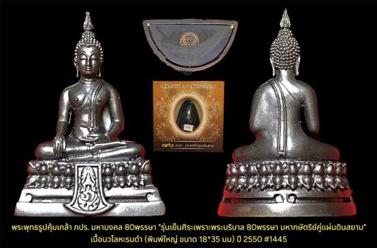 พระพุทธรูปคุ้มเกล้า ภปร. มหามงคล 80พรรษา "รุ่นเย็นศิระเพราะพระบริบาล 80พรรษา มหากษัตริย์คู่แผ่นดินสยาม" เนื้อนวโลหะรมดำ (พิมพ์ใหญ่ ขนาด 18*35 มม) ปี 2550 #1445