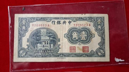 ธนบัตรโบราณมูลค่า 10 เซนต์ (1 เจียว) ออกโดยธนาคารกลางแห่งประเทศจีน (The Central Bank of China) ยุคสมัย: เป็นธนบัตรที่ใช้ในช่วงปี ค.ศ. 1930 ถึง 1940 ในช่วงสาธารณรัฐจีน |
