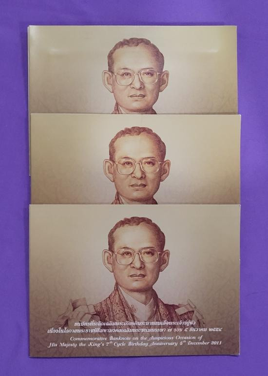 ธนบัตรที่ระลึก 100 บาท ร.9 พระชนมายุ 7 รอบ 3 ฉบับ เลขเรียง |