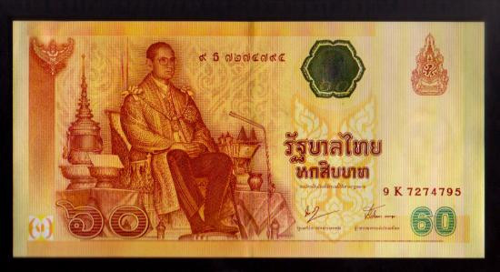 ธนบัตรที่ระลึก 60 บาท พระบาทสมเด็จพระเจ้าอยู่หัวรัชกาลที่ 9 ฉลองสิริราชสมบัติครบ 60 ปี ## ไม่ผ่านการใช้ |
