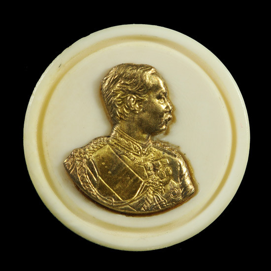 เหรียญรัชกาลที่ 5 เนื้องาช้างแมมมอธ "หน้ากากทอง" "พิมพ์เล็ก" รุ่นคชสารหมื่นปี หลวงพ่ออุตตมะ วัดวังก์วิเวการาม ปี2540 สวยๆ ไม่มีกล่องนะคะ พร้อมใบยิงเปอร์เซนต์ทอง |