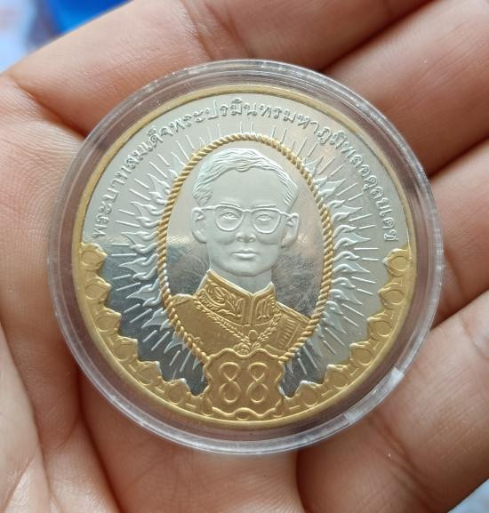 เหรียญที่ระลึก เฉลิมพระเกียรติ ในหลวงร.9 88 พรรษา เนื้อเงินขัดเงา เคลือบทองคำแท้บางส่วน |