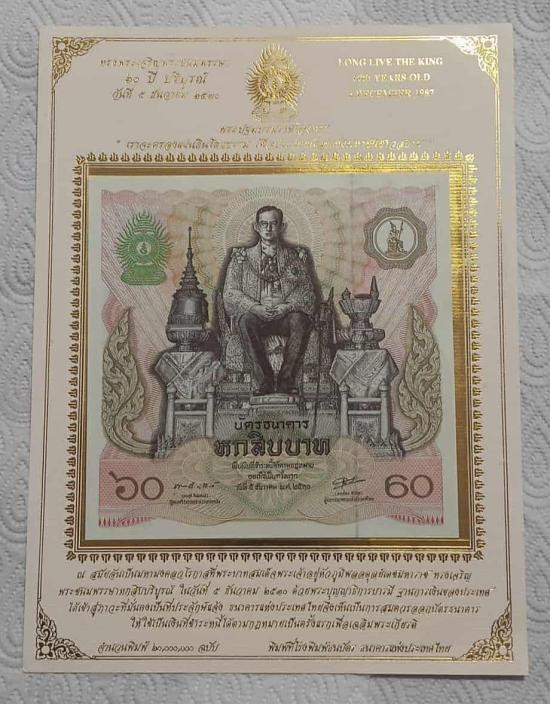 บัตรธนาคาร 60 บาท พระบาทสมเด็จพระเจ้าอยู่หัว รัชกาลที่ 9 เฉลิมพระชนมพรรษาครบ 5 รอบ ไม่ผ่านการใช้งานพร้อมปกจำนวน 1 ฉบับครับ |