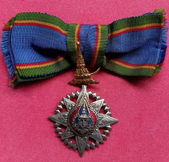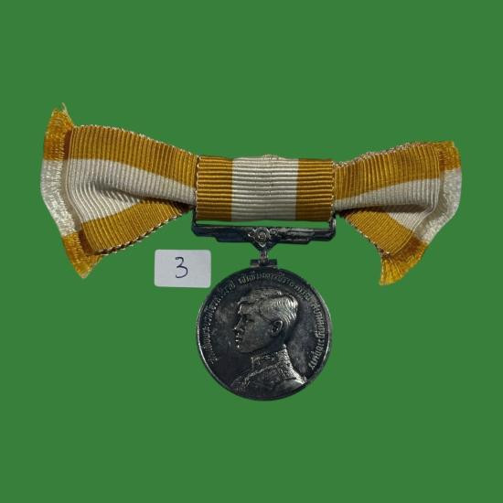 เหรียญเครื่องราชย์อิสริยาภรณ์ มหามงกุฎ หลัง จปร. เนื้อเงินลงยาพร้อมแพรแถบ โบว์สุภาพสตรี |