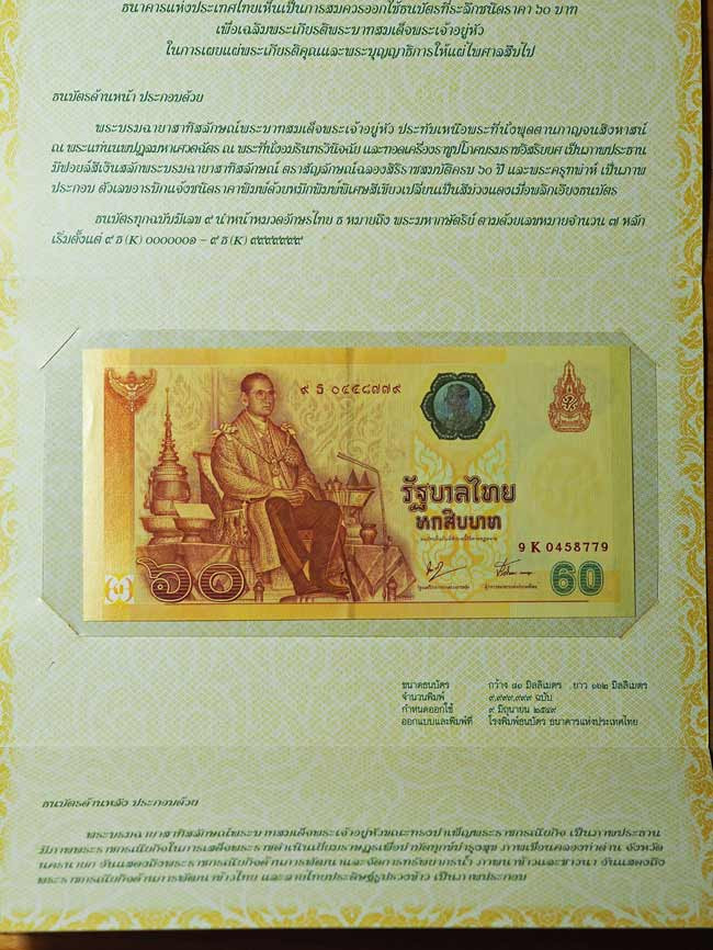 ***ธนบัตรที่ระลึก 60 บาท พระบาทสมเด็จพระเจ้าอยู่หัวรัชกาลที่ 9 ฉลองสิริราชสมบัติครบ 60 ปี พร้อมซองเดิม*** |